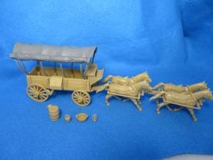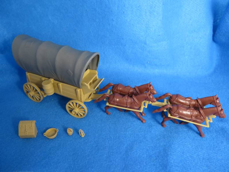 CTS753I Classic Toy Soldiers Western Conestoga Wagon in tan with 2 different tops in dark gray one with rolled up sides. Has 4 horses ( brown). Driver not included. CTS wagons are modeled from the iconic Marx western wagons but slightly large, 4 1/4" long by 1 1/4" wide, and they have a a hinged tailgate that operates.(1:32 scale) plastic toy soldiers. (Second wagon is not included used only to show second top)