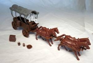 CTS753N Classic Toy Soldiers Western Conestoga Wagon in brown with 2 different tops in gray one with rolled up sides. Has 4 horses ( brown) and a driver with kepi hat. Driver color varies (blue + gray). CTS wagons are modeled from the iconic Marx western wagons but slightly large, 4 1/4" long by 1 1/4" wide, and they have a a hinged tailgate that operates.(1:32 scale) plastic toy soldiers. (Second wagon is not included used only to show second top)