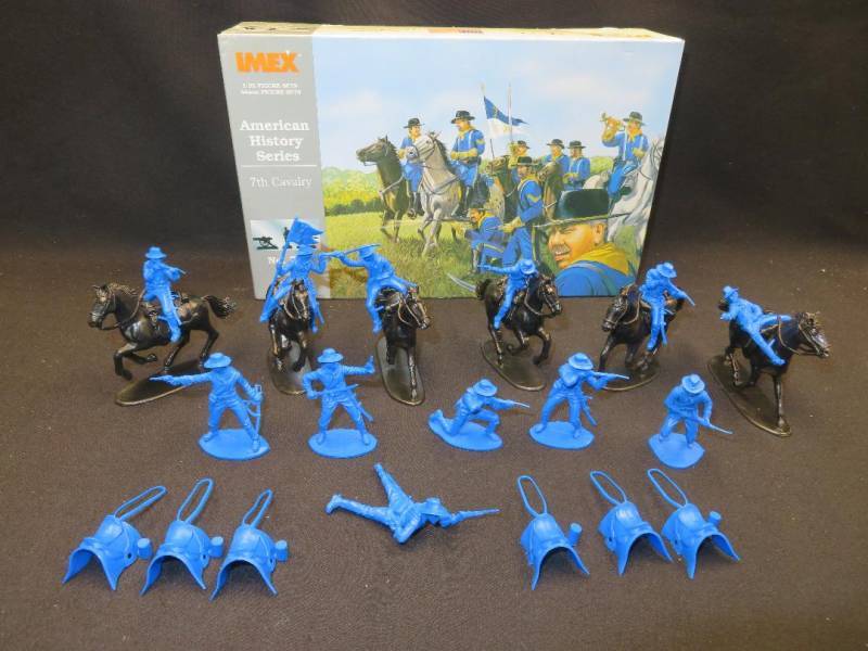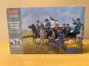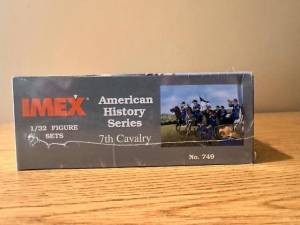Imex: IMX749 7th Cavalry includes 6 mounted Cavalrymen figures and 6 standing Cavalrymen. This is old store stock from 1996 the box is still sealed and in its original shrink wrap. These have been long retired. These were the originally the Airfix 7th cavalry figures that Imex had contracted with Humbrol to release these as Imex figures.