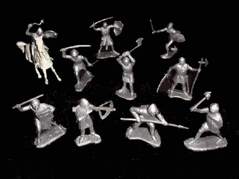 Marx: MXR164B Medival Knights 25 figures in 10 poses ( you will get at least two of each pose) in black along with two Marx 60MM knight horses.These were produced back in the mid 1990's and are in perfect condition. Plus they include the Marx 60MM knight horses which have not produced again since 1993.