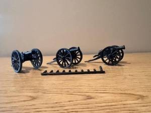 3 - MARX 6 pounder Field Cannons (black) you will get three MXR731C for 1:32 scale plastic toy soldiers.This is the cannon Marx used in many of their Fort Apache, Alamo, Civil War, Rev War and even Military Academy and other playsets. These were made from the original Marx molds. Includes a set of 10 shells-- most if not all still attached to the runner. Made in a very nice soft plastic. VERY LIMITED NUMBER AVAILABLE!
