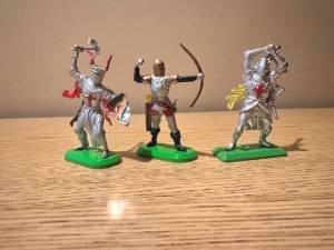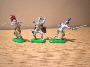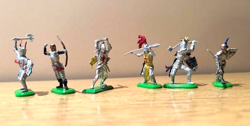 Britains Deetail: BRT189A 6 Dismounted Knights (painted in a nice flat finish and with metal bases) in 6 different poses. The weapons are interchangeable. These are old store stock out of a private collection